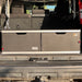 CargoKits Drawers are the best built drawers for your adventures that you can find. They are constructed using powder coated aluminum, extruded aluminum crossbars, HPDE panels, stainless steel hardware, and heavy duty locking drawer slides. There is no plywood used in the manufacturing of this product. The aluminum construction keeps the weight down, but is incredibly strong. With marine grade HDPE panels moisture is of no concern, and the panels are solid throughout not relying on a finishing layer.