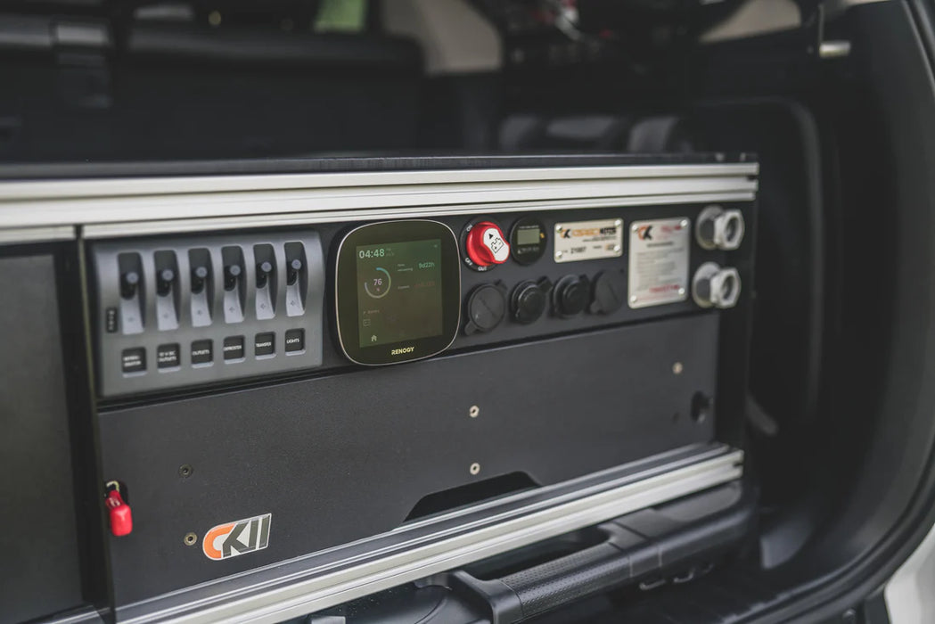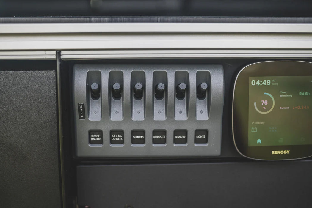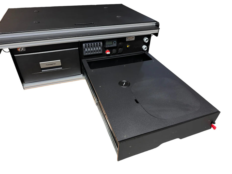 • 100AH lithium battery w/ charger + (6 Circuit Fused Switch Panel + (2) Twin quick charge USB outlets + (1) 15amp 12v plug + (1) User Defined Circuit w/Anderson Connector (User defined circuit not available if ordered with Dometic Coolmatic Refrigerator Drawer) + Defrost circuit to thaw plumbing (The remaining two circuits are used or the Transfer feature and the Lights of the CargoKItchen)
