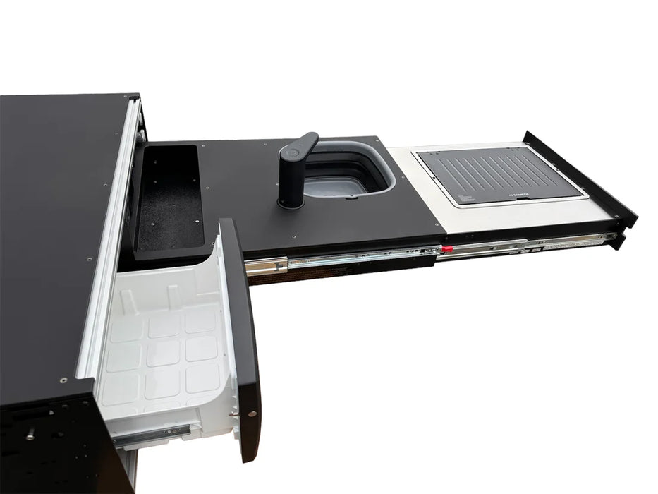 The CargoKitchen II has all the same great features as its predecessor, while leveraging our drawer system platform. This upgrade boosts cargo storage and doubles the unit's water storage capacity. Moreover, the CargoKitchen II comes with one large storage drawer (with the option to substitute a refrigeration drawer) as well as an optional Renogy Battery System and, on certain models, a sleeping platform.