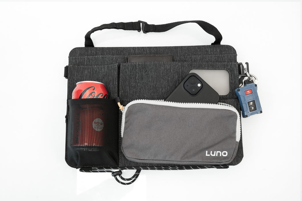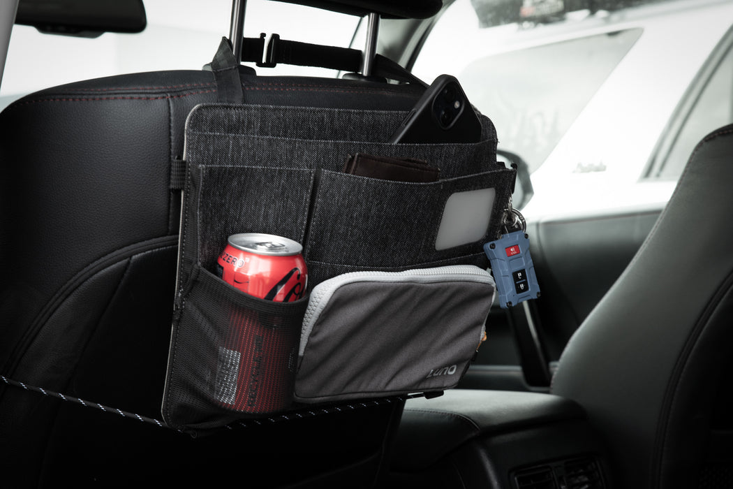 A definite improvement on the black-hole-like pockets behind the front row seating, the Seatback Organizer has designated zones for all of your travel essentials and built in space for a few little luxuries. This handy organizer will be your new road trip MVP.
