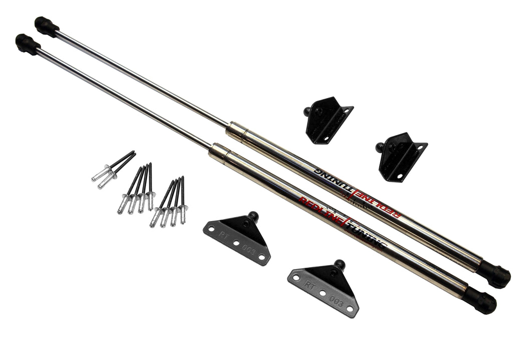 PROGRESSIVE-RATE GAS SPRINGS - Redline Tuning gas springs are not off-the-shelf parts, they are designed by us and manufactured to our specifications for each vehicle application. Our exclusive end-of-stroke dampening slows the rate of extension over the final inches of travel eliminating stress to the hood.