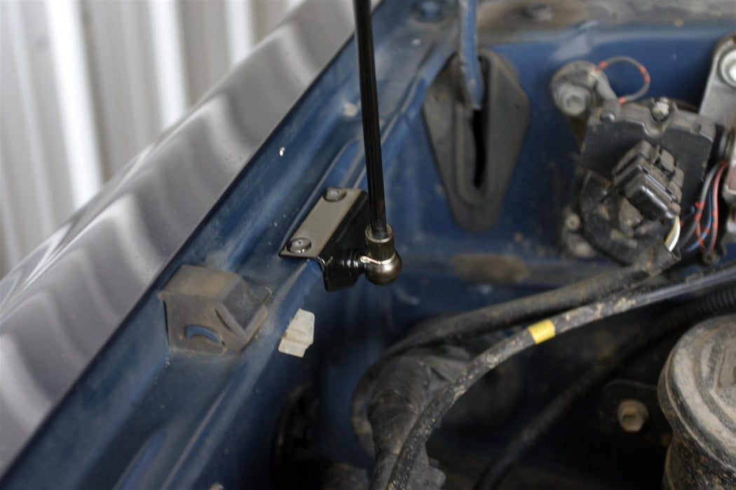BLACK GAS SPRINGS - The gas springs used in this application each have a black e-coated steel body with black annealed extending rod. The end-fittings used are designed specifically for this application. Gas strut orientation is always body end up (large tube attaching to hood bracket) and extending rod attaches to lower ball stud.