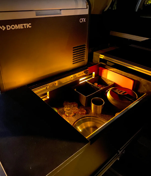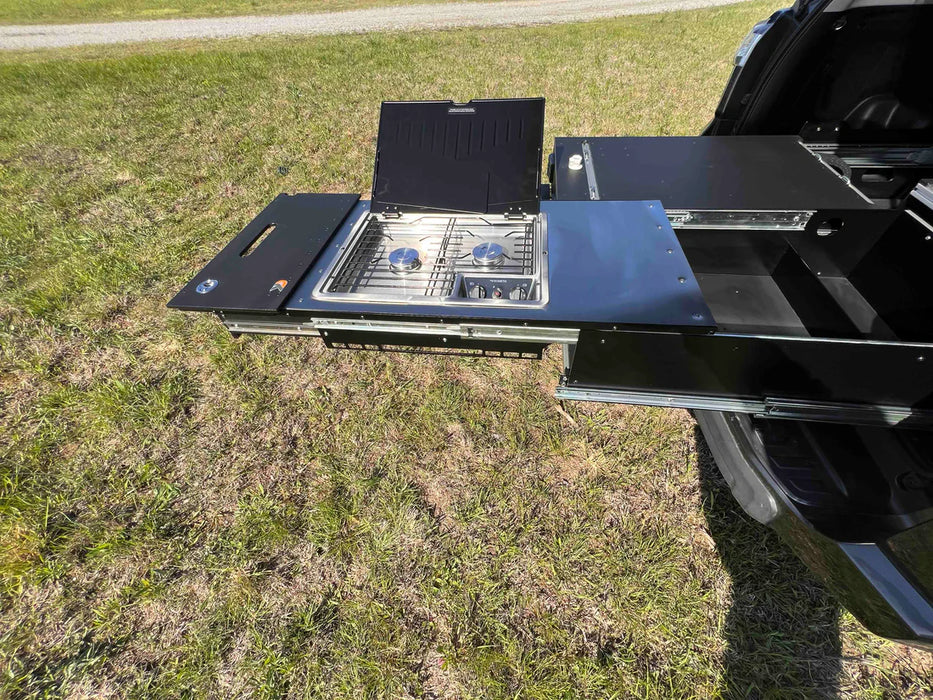 CargoKitchen is a rapid deploying kitchen that fits in the cargo compartment of an SUV. Including a two burner cooktop, refrigerator/cooler slide out, and a sink with running water. CargoKitchen has everything you need to whip up a delicious meal with ease while on the go without the hassles associated with setup and tear down. The unit can be easily removed from your vehicle when needed.