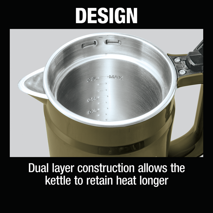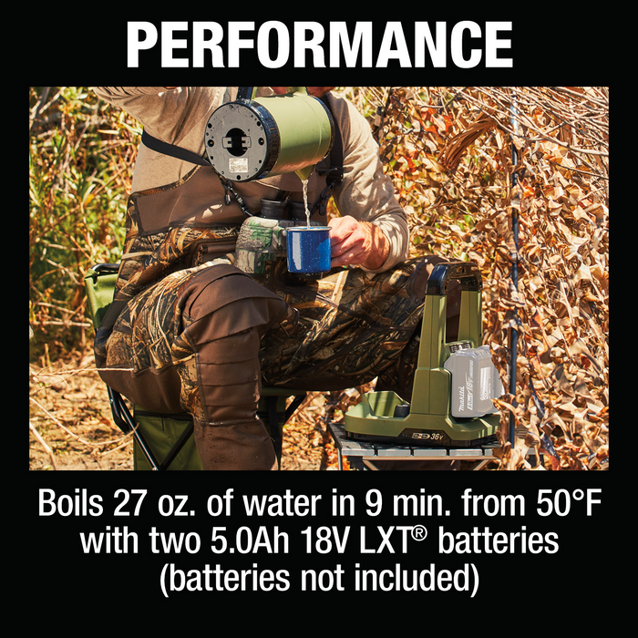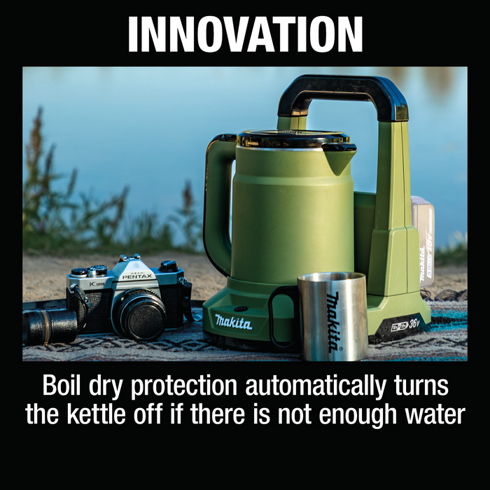 Get the convenience of boiling hot water anywhere while enjoying the outdoors with the Outdoor Adventure™ 36V (18V X2) LXT® Hot Water Kettle (ADTK01). The kettle can produce 27oz of hot water in just nine minutes when powered by two 18V LXT® 5.0Ah batteries (sold separately). For added convenience, the kettle automatically shuts off when the water is boiled. It has a boil-dry feature that does not allow for operation when empty, and a sensor that prevents the kettle from operating when not on a stable surface. The Kettle has a convenient carry handle on the top for easy portability.
